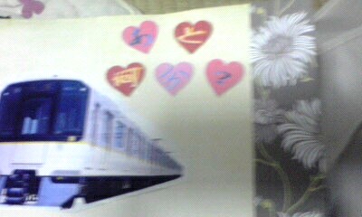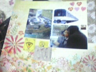 走らせてた電車(灰色と黄色)の写真をチラシから切り取ってハリハリ。